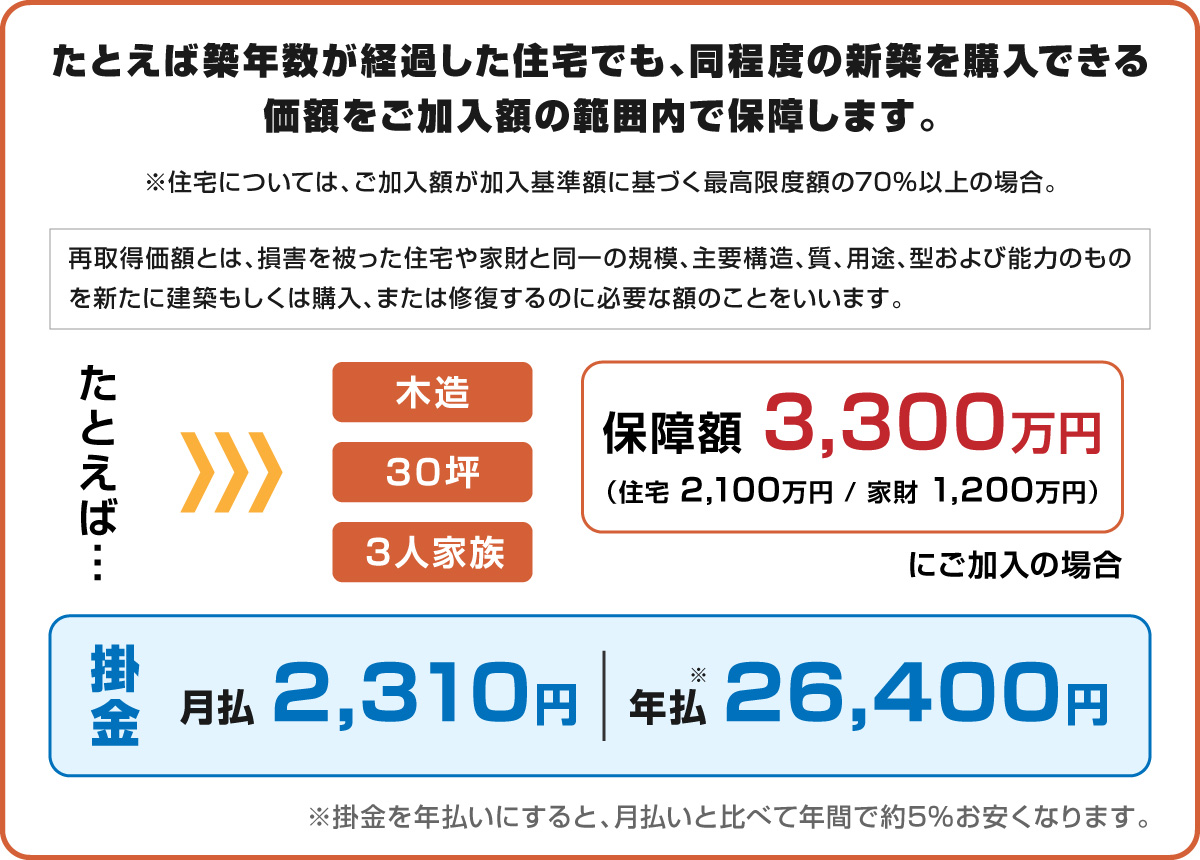 ※臨時費用共済金はご加入の住宅または家財の火災等に伴う、生活上の臨時の支出に充てるために要する額として、1回の共済金の支払事由につき200万円を限度に、その火災等共済金の20%の額を臨時費用共済金としてお支払いします。